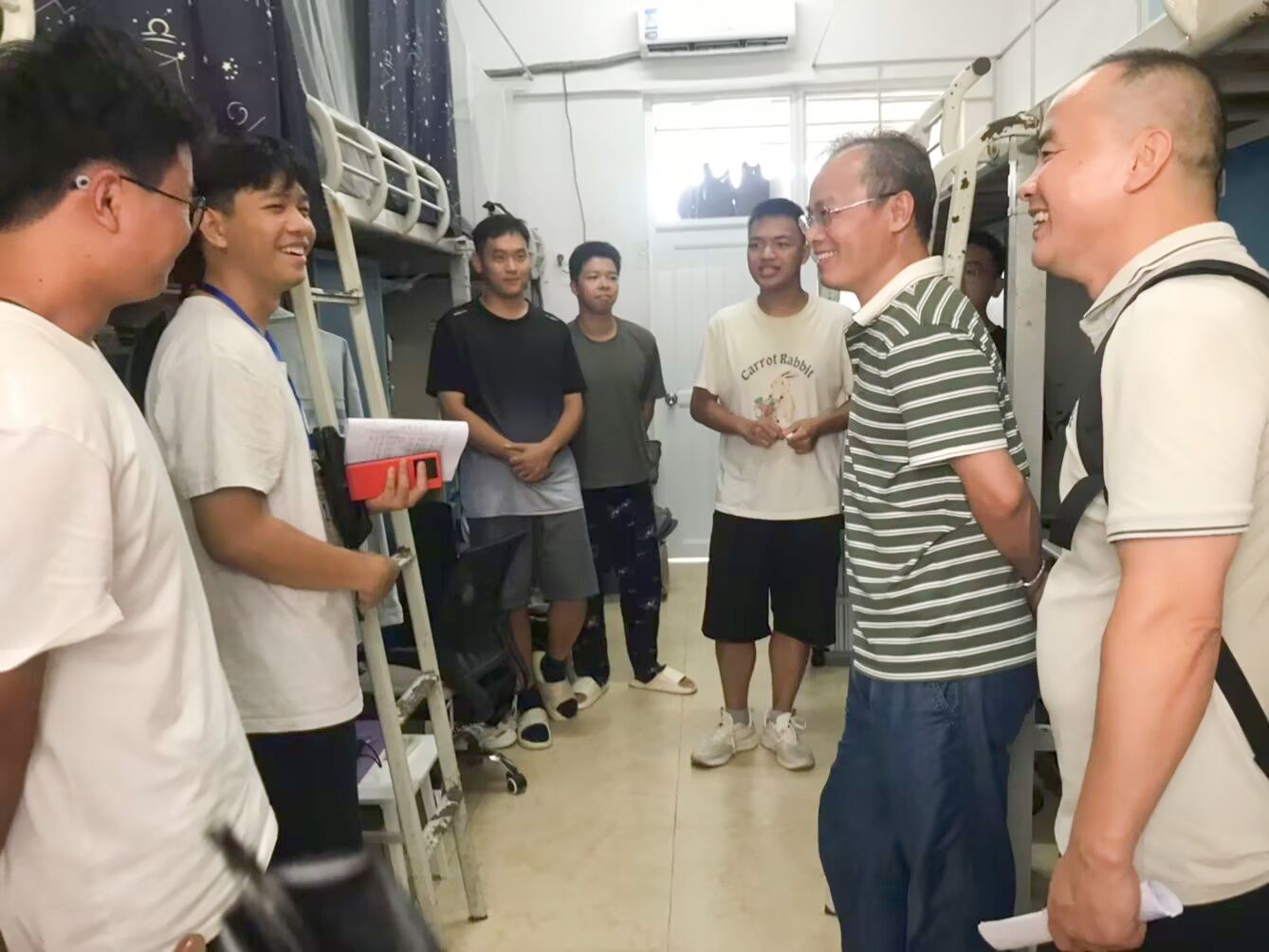 领导和老师们逐一走进77间新生宿舍,与新生亲切交谈,让新生宿舍充满了温暖与欢声笑语,受到新生们的热烈欢迎。他们详细询问新生的家乡籍贯、对新环境的适应程度以及对老员工活的期待等,细心地提醒新生们要注意防诈反诈,遵守公司的规章制度,舍友间团结互助、共同进步。