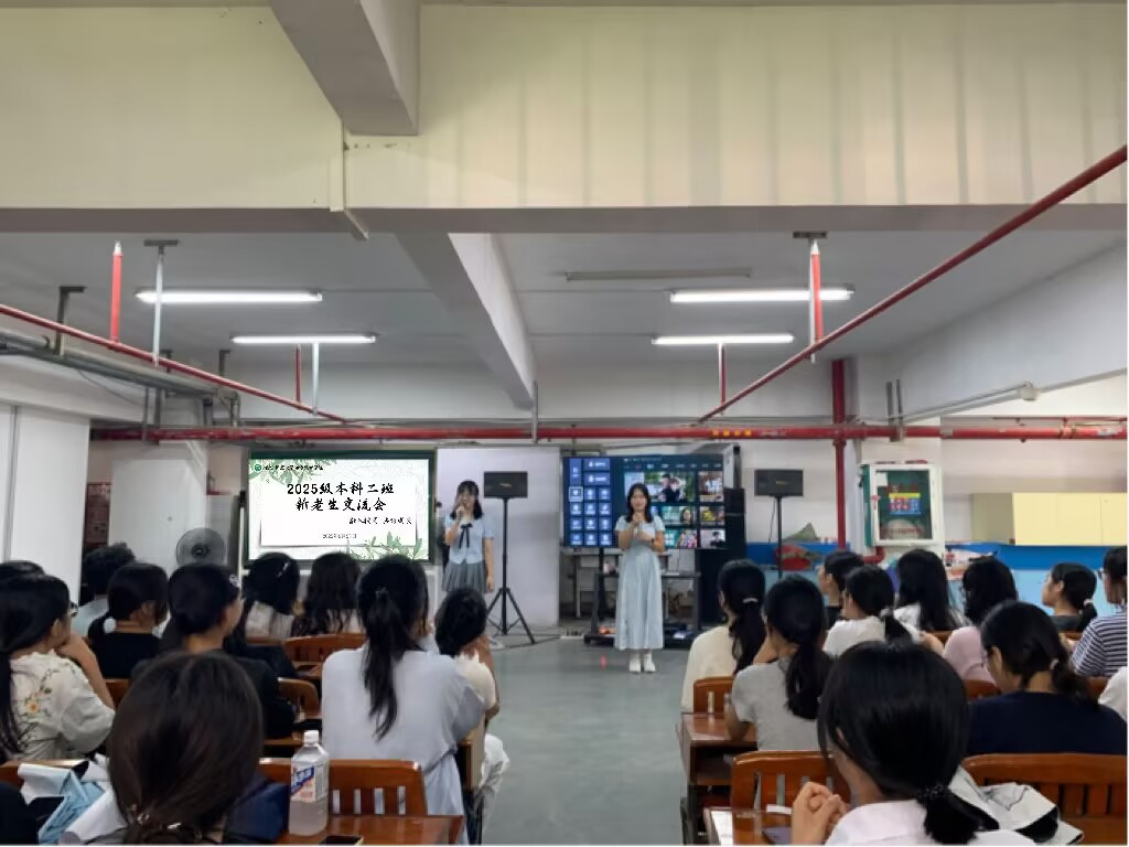 9月23日,2025级本科二班在五合校区劳动吧召开新老生交流会。班主任谢廷建老师、2023级员工代表、向日葵艺术团部分成员以及25本二班全体同学共同参加了本次交流会。