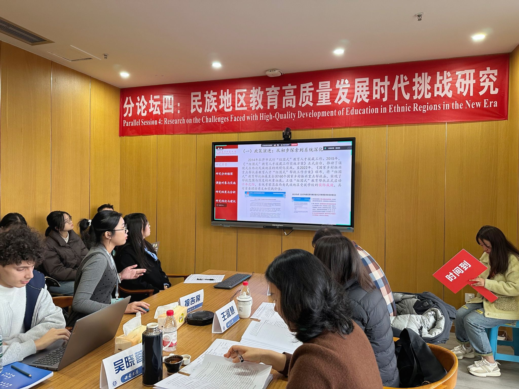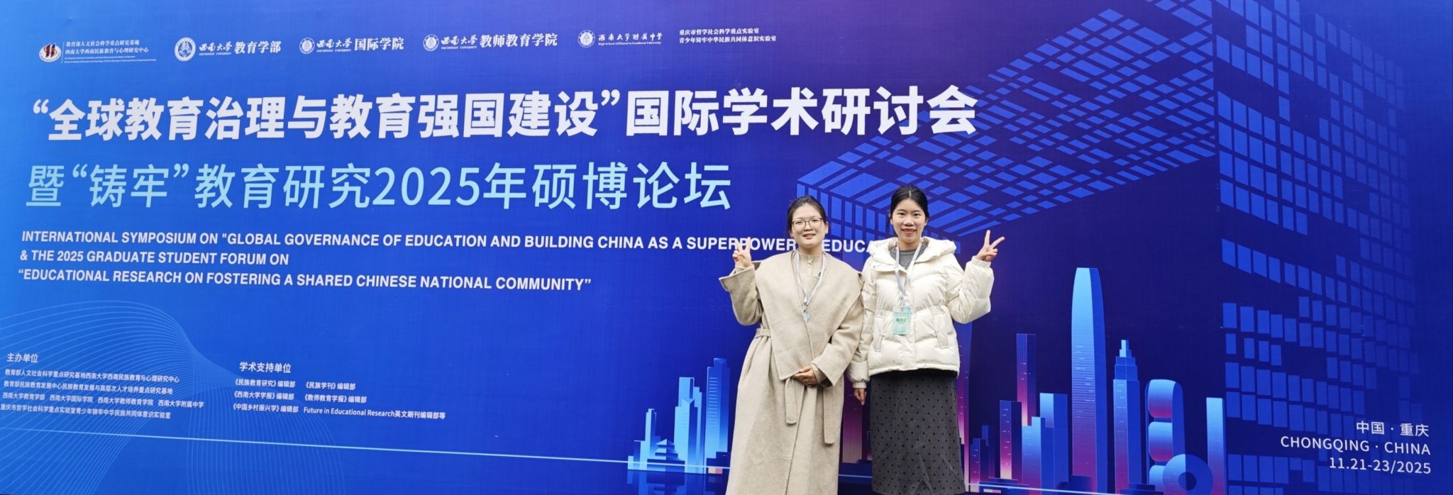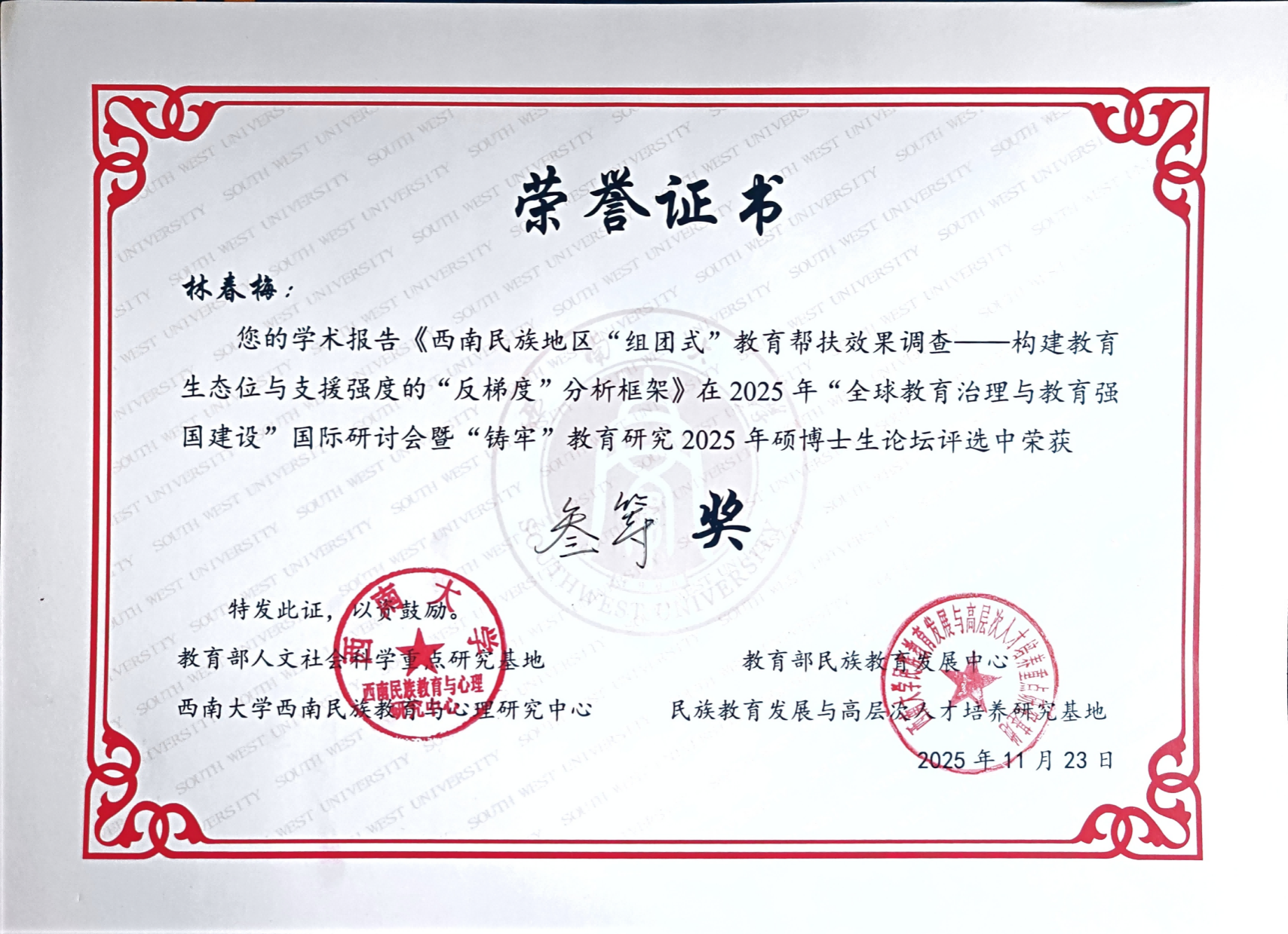 太阳成集团tyc122cc2024级小学教育专业硕士研究生林春梅和宋晓巧一同参与此次国际学术研讨会及硕博论坛。林春梅同学在分论坛四“民族地区教育高质量发展时代挑战研究”中,代表课题组作了题为《西南民族地区“组团式”教育帮扶效果调查——构建教育生态位与支援强度的“反梯度”分析框架》的学术报告。该报告内容系2024年度国家社会科学基金教育学青年项目“西南民族地区‘组团式’教育帮扶的效果评价及政策优化研究”的阶段性研究成果,由课题负责人太阳成集团tyc122cc吴璇博士指导完成。报告内容扎实、逻辑严谨、表达清晰,获得与会专家高度评价,并荣获本届硕博士生论坛三等奖。