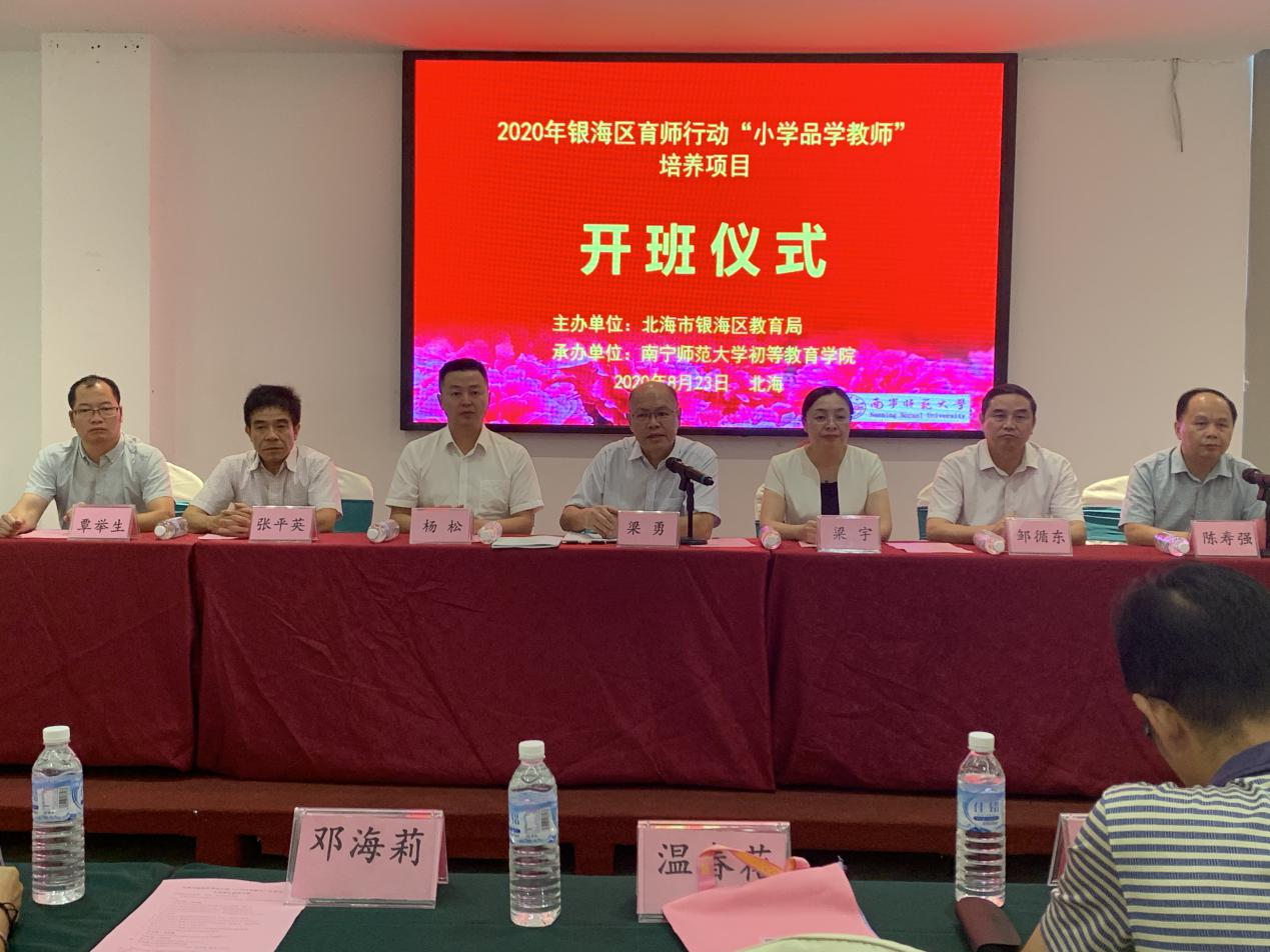 为促使北海市银海区义务教育从基本均衡走向优质均衡,努力实现银海区“教育强区”的目标,北海市银海区教育局决定启动北海市银海区小学语文、数学、英语学科“品学教师培养工程”,培养一批“头雁”式小学语文、数学、英语学科教学领军人。受北海市银海区教育局委托,太阳成集团tyc122cc于8月23日—27日举办了2020年北海市银海区育师行动“小学品学教师”第一阶段培训。银海区教育局局长、党工委副书记梁勇,北海市银海区教育局党工委书记、副局长张平英,太阳成集团tyc122cc经理梁宇教授等参加开班典礼。来自银海区育师行动小学品学教师50名学员参加培训。