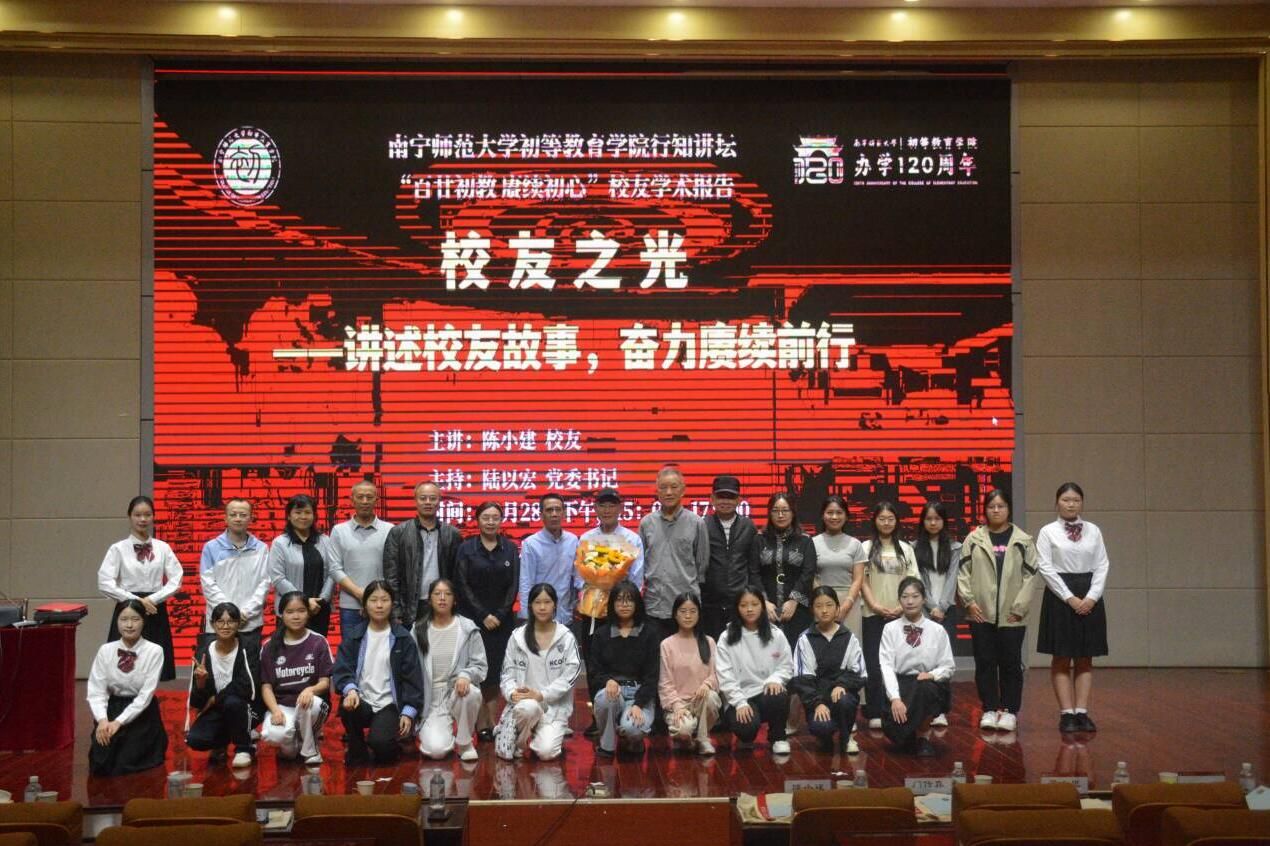 报告在师生代表与陈小建员工合影留念中落下帷幕。此次报告既深化了师生对院史与员工文化的认知,也为师范生传递了成长的精神力量。后续公司将继续邀请优秀员工返校,以“行知讲坛”为纽带,凝聚员工资源,助力学子成长为新时代优秀教育工作者。